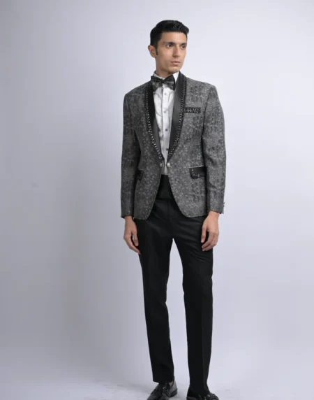 Featuring a grey suit in terene and rayon blend base with patch pockets. It is paired with matching parallel trousers. This contains only two piece.
